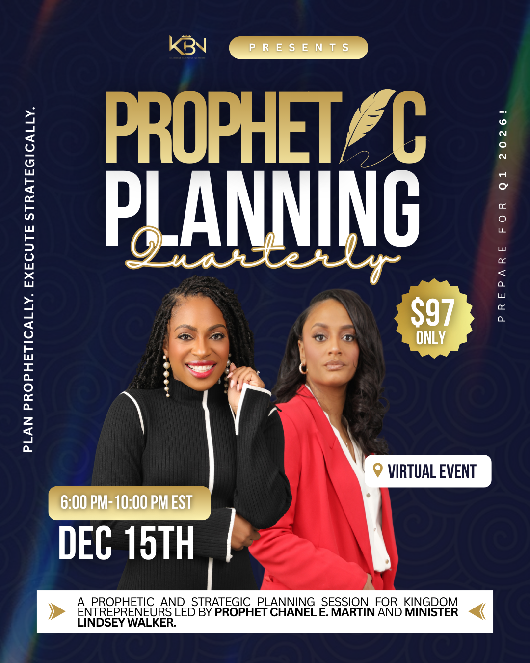 Prophetic Planning Quarterly is a 4-hour virtual planning session created for faith-driven business owners, ministry leaders, and creatives who want to move into the new year with clear direction and a plan they can execute with confidence.